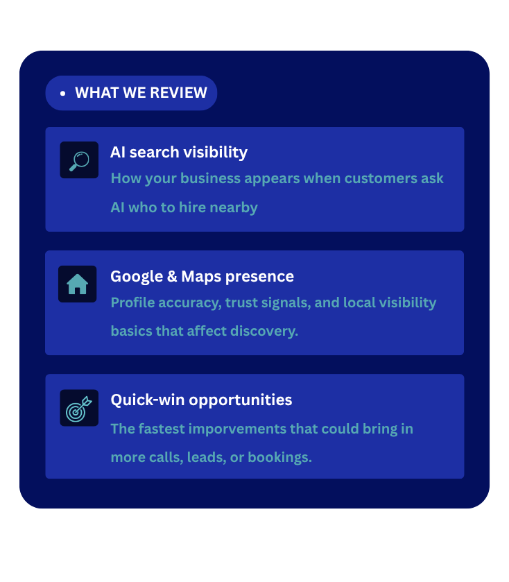 We show local businesses how Google, Maps, and AI tools currently see them — then give a clear action plan to help them get found again and stop losing easy opportunities.
